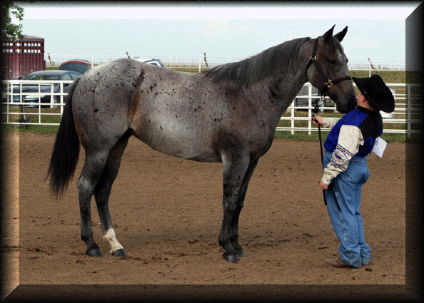Rowdy Blueberry is 43.75% Blue Valentine bred. He is a beautiful roan.